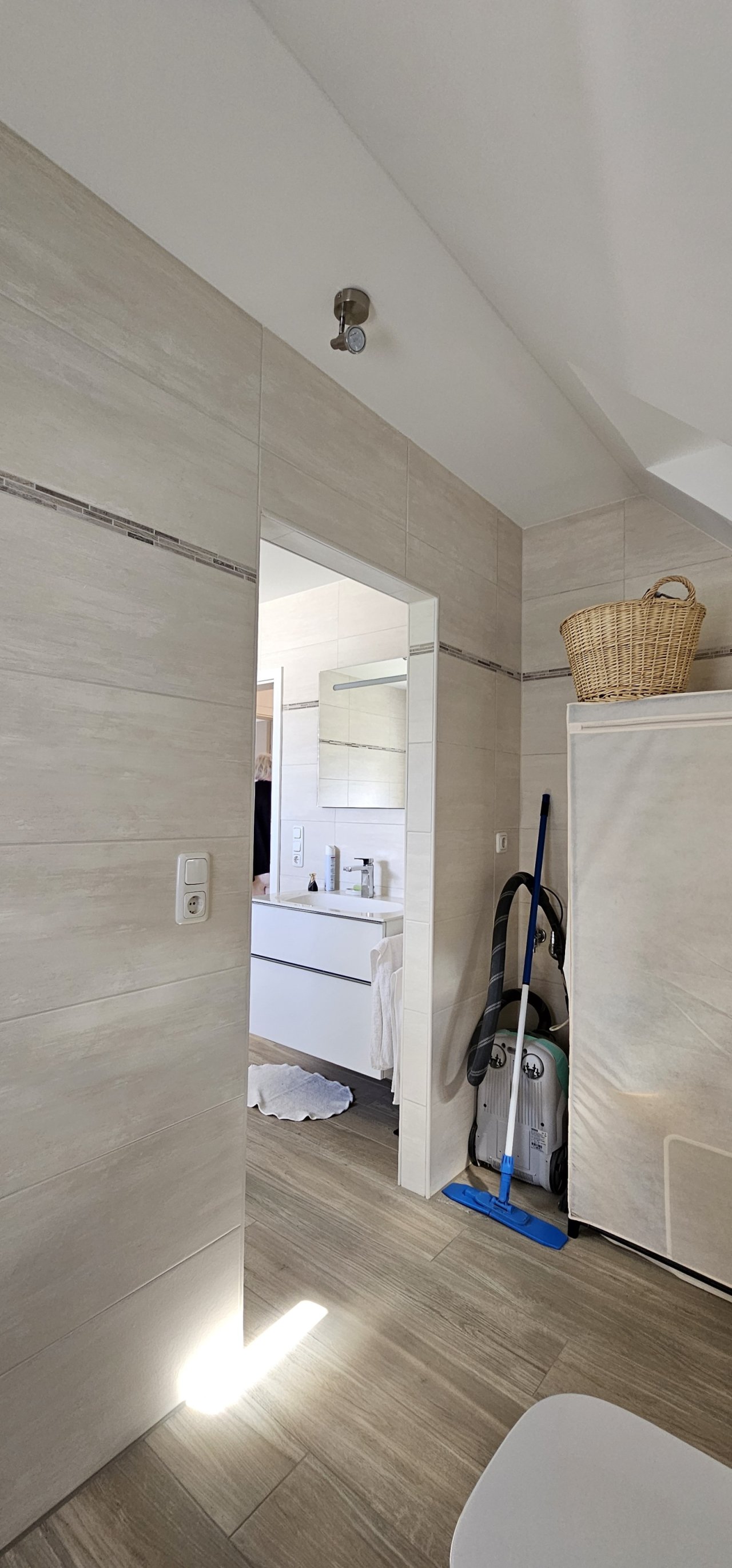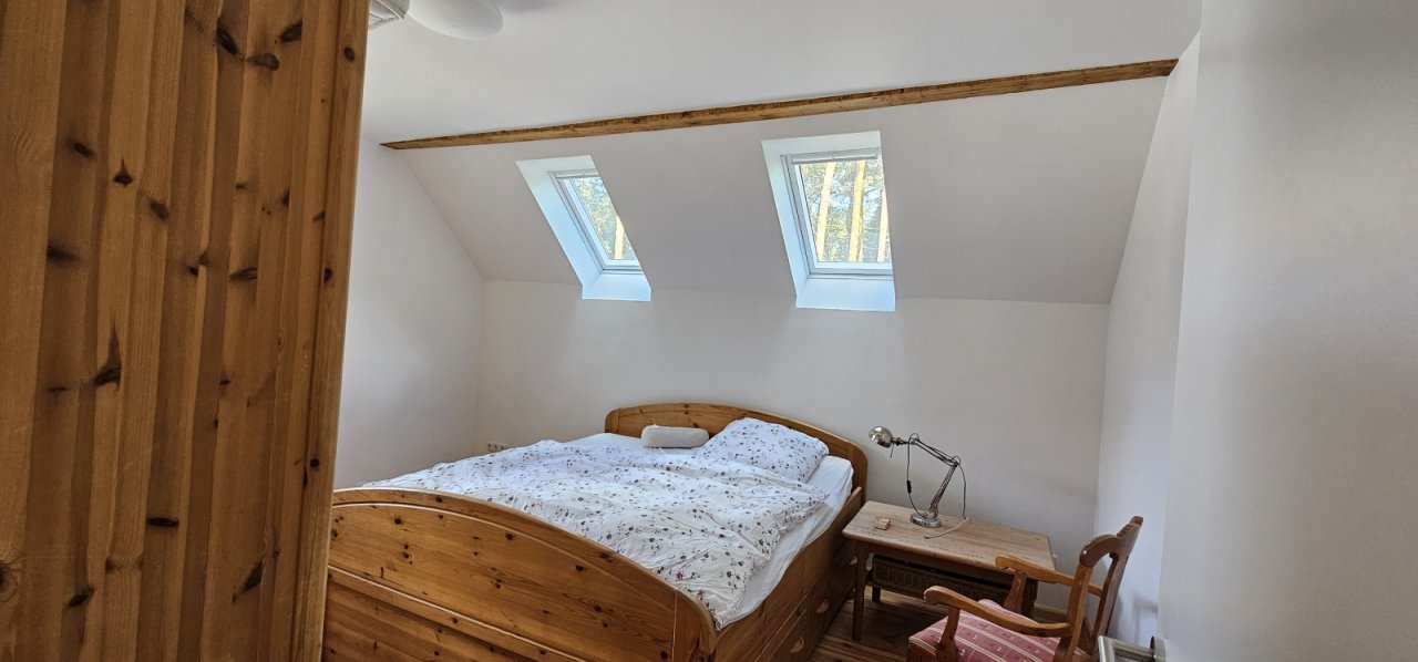 Das Bad ist geteilt und bietet Waschtisch, Bidet/Toilette, Badewanne und eine ebenerdige Dusche; Fußbodenheizung und Handtuchheizung sorgen für behagliche Wärme. Die Dachfenster sind neue Velux-Fenster mit Jalousien; das Dachkonzept ist als Kaltdach umgesetzt, und die Decke vom Obergeschoss ist gedämmt. Im Keller befinden sich noch Öltanks, aktuell zu etwa einem Drittel befüllt; Entsorgung sind optional möglich. Beheizt wird das Haus durch eine neue Wärmepumpe, Warmwasser wird über Solar erzeugt.