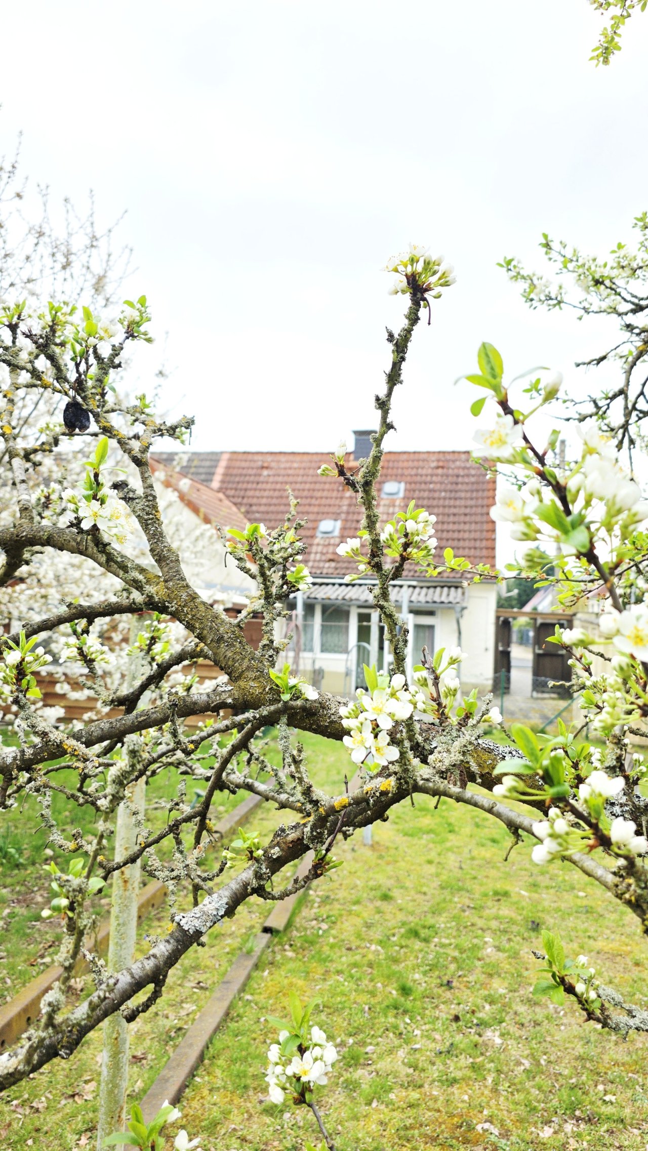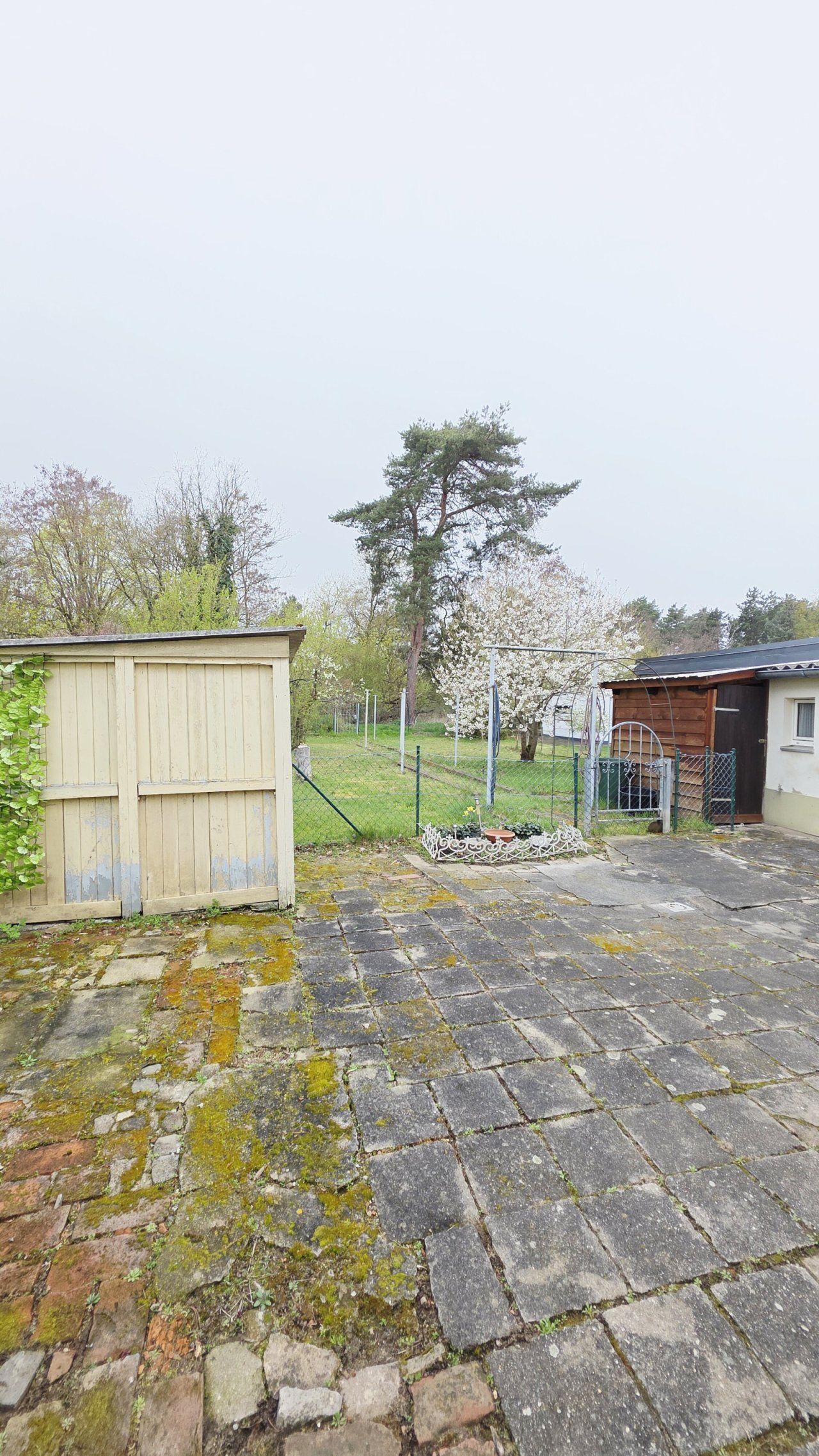 Auf dem eingefriedeten Grundstück befinden sich Geräteschuppen und eine Gartenlaube.